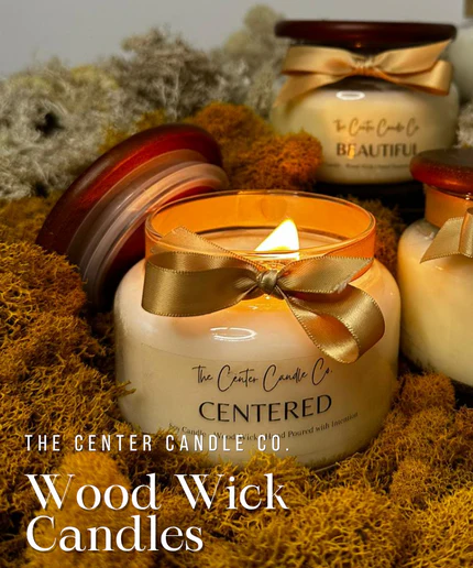 Experience relaxation with our 100% natural soy wax candles, enhanced with essential oils and wood wicks for a soothing crackle and up to 55 hours of burn time. Each scent, from "Centered" to "Rested and Healed," promotes peace and balance, blending wellness with luxury.